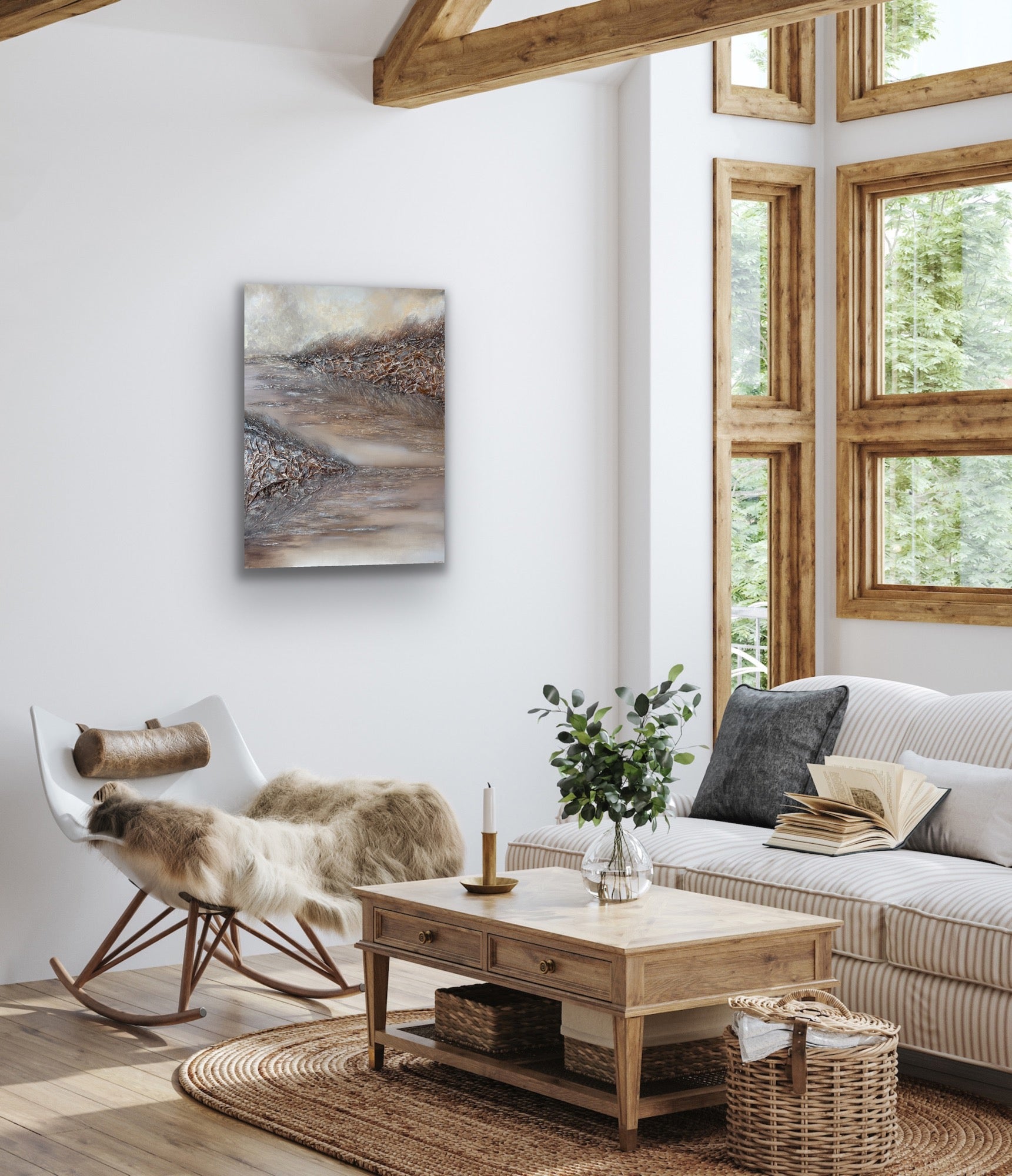 In Confluence, bronze and beige tones flow together in a meeting of textures and light, evoking the moment when separate currents merge into one. Angular, rock-like formations rise from the surface, their metallic highlights catching and shifting with the light, creating a sense of movement and transformation. The soft gradations in the background contrast with the tactile ridges and crests in the foreground, suggesting the merging of forces—land and water, light and shadow, stillness and motion. This piece invites the viewer to pause at the meeting point, where boundaries dissolve and new forms take shape.