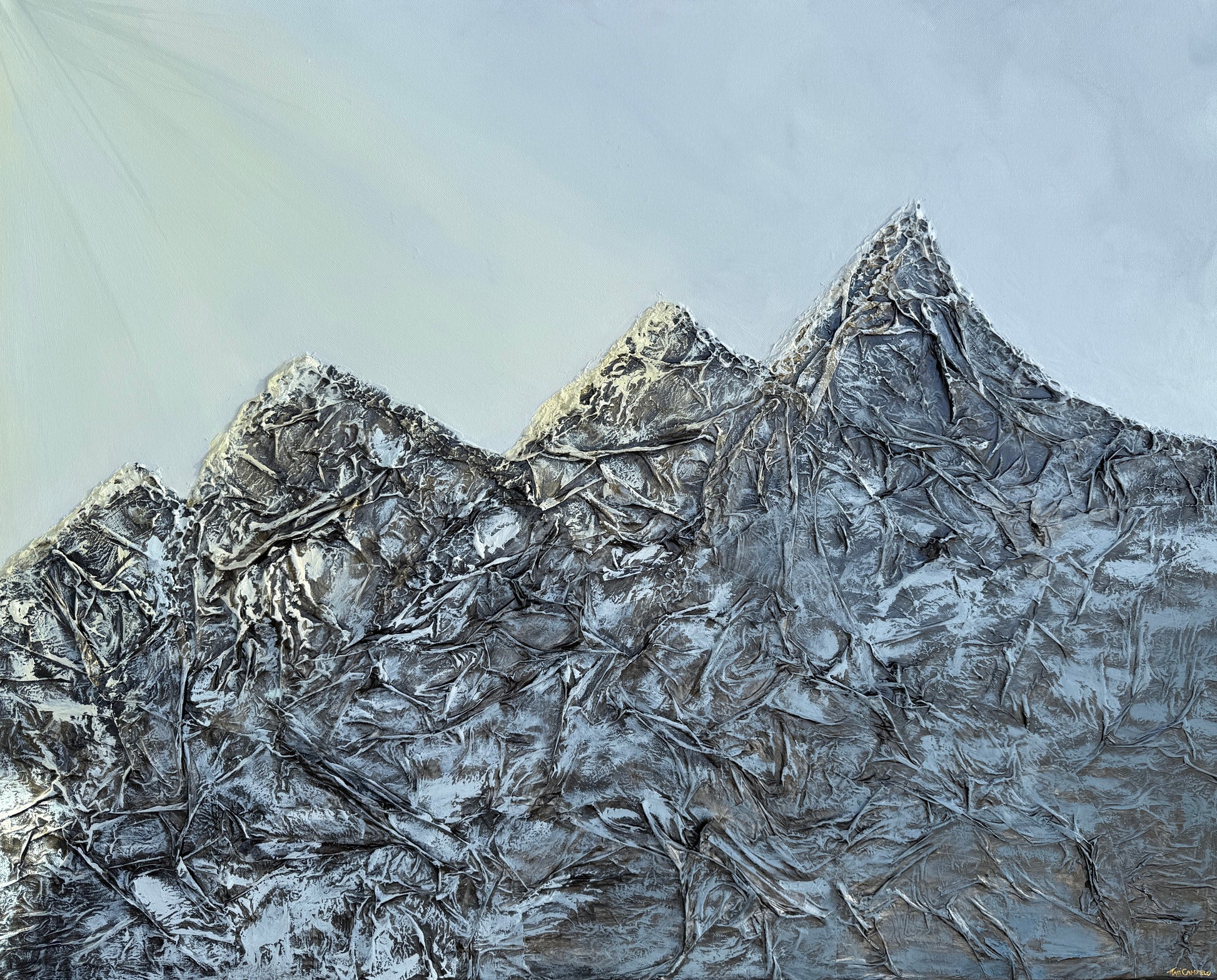 Summit Gleam captures the quiet majesty of snow-covered peaks illuminated by golden light. Sculpted with my signature textured technique, the mountains rise with tactile depth, while radiant gold accents shift with the light—echoing the ever-changing beauty of nature. A standalone piece that invites stillness, reflection, and awe.