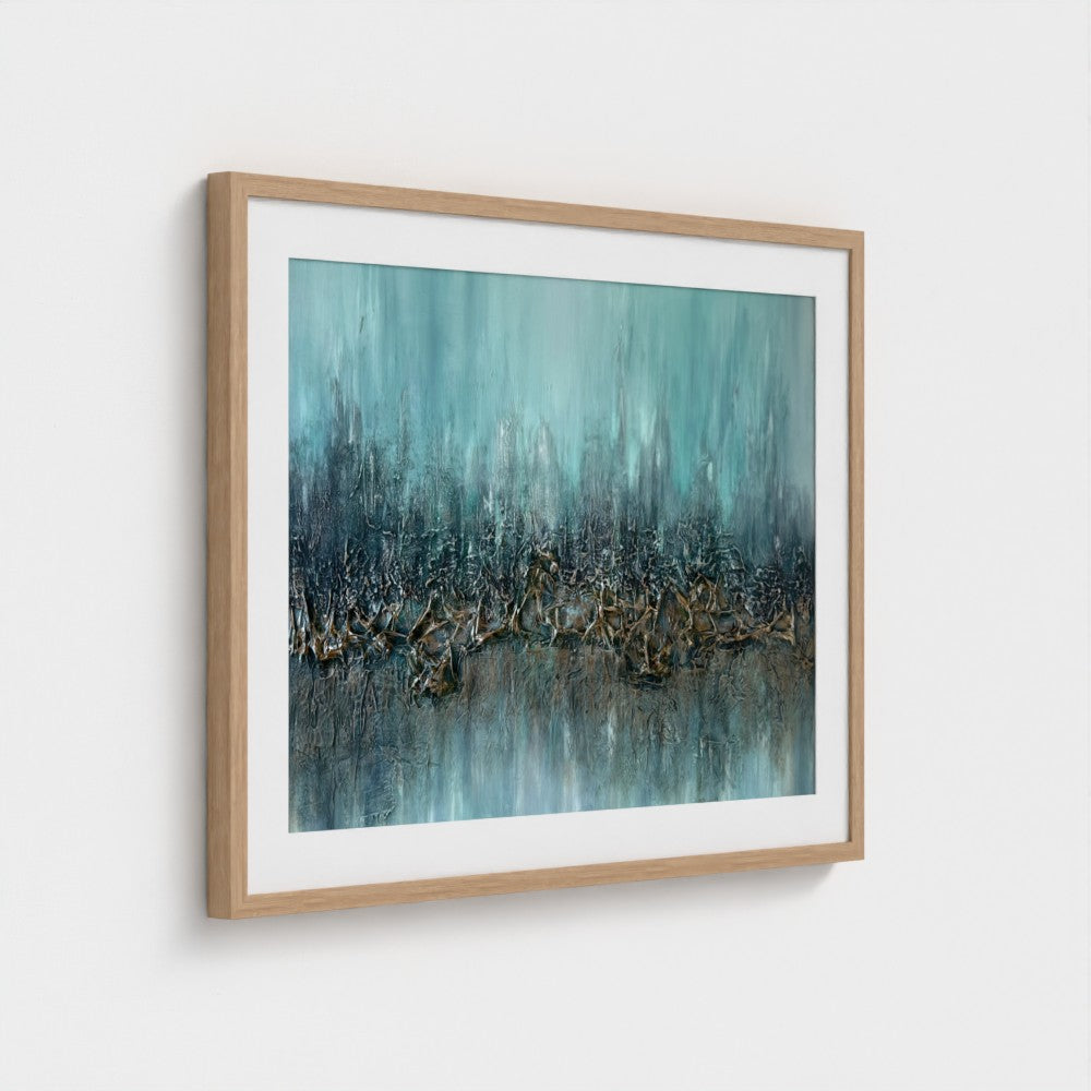 About this artwork: This piece explores the quiet resilience of nature through layered textures and gradients. A central band of rugged, metallic-like formations evokes geological erosion, contrasting with smooth turquoise fields that suggest atmospheric calm. Bronze and copper highlights glimmer against cooler tones, creating a dialogue between strength and fragility. The tactile surface invites contemplation