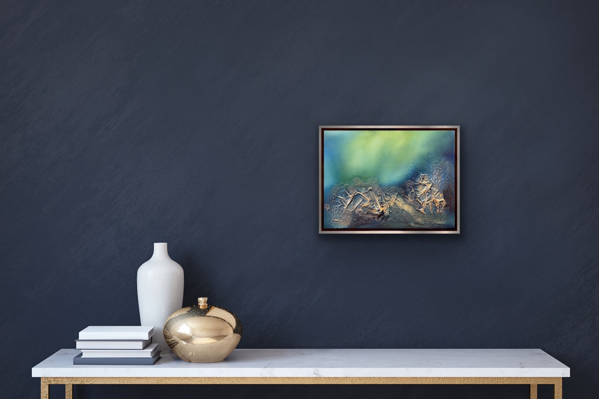 About this artwork: A captivating composition that marries the timeless elegance of gold with the tranquil depths of blue. The interplay of these enchanting tones evokes a sense of otherworldly beauty, offering a visual journey into the transcendent essence of this piece