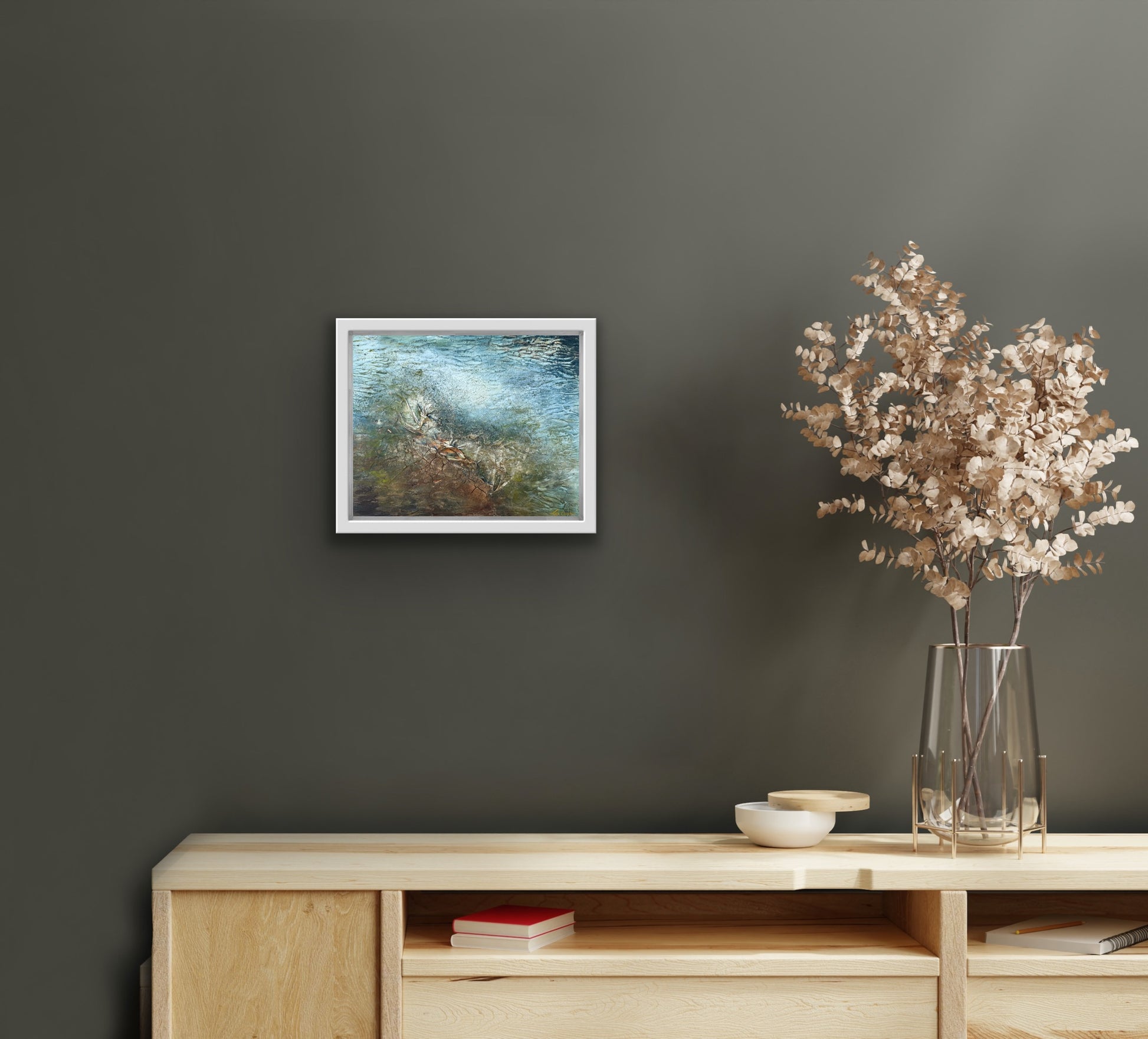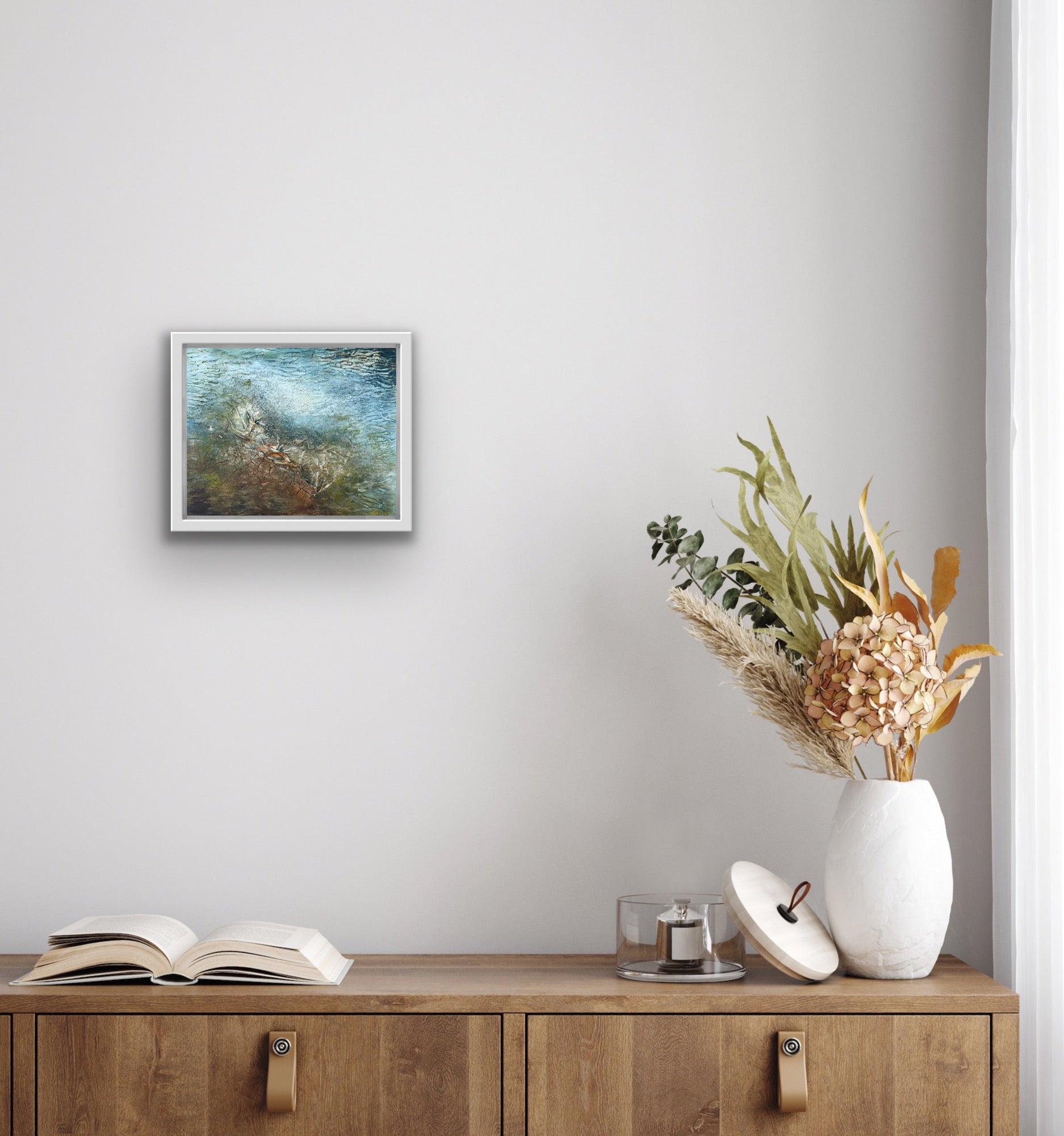 A subtle interplay of texture and tone evokes the sensation of light bending through shifting surfaces. Cooler hues dominate the upper half, gradually warming toward the lower edges where fragmented earth tones emerge through layered material. The piece captures the moment where structure dissolves into fluidity, and perception flickers — as if looking through water