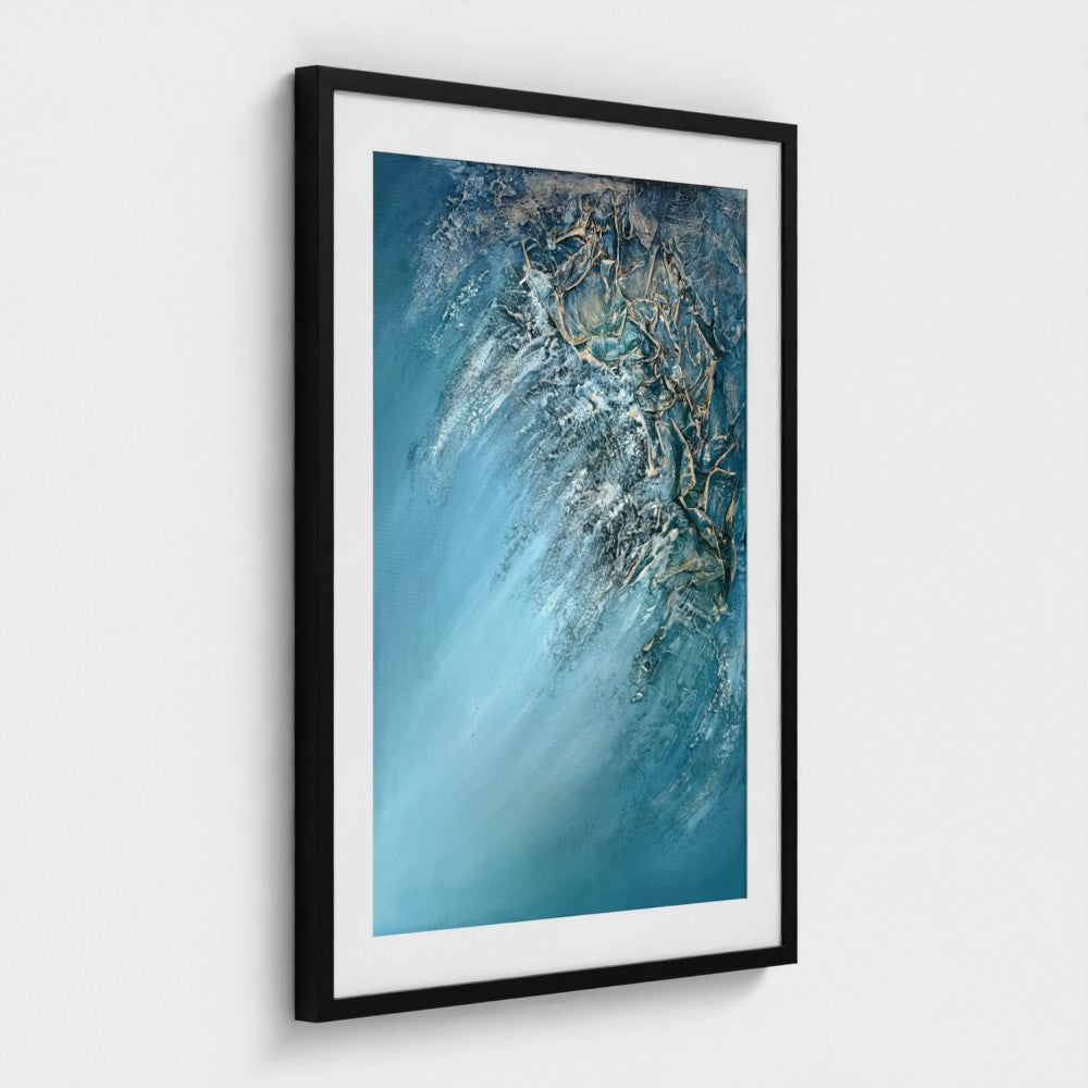 About this artwork: Surge celebrates vitality and depth. Aqua hues cascade across textured surfaces, suggesting currents that carve pathways through time and space